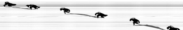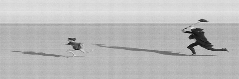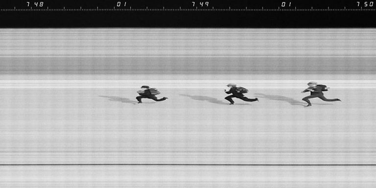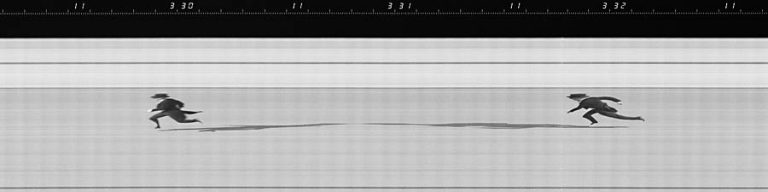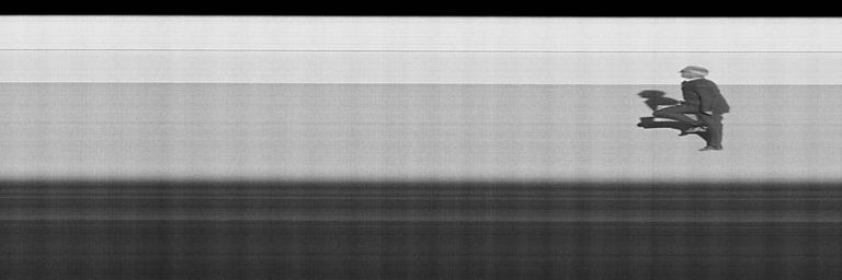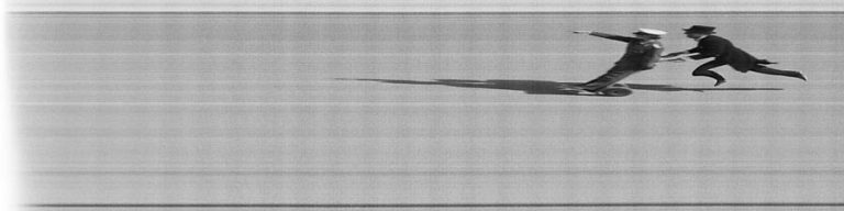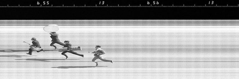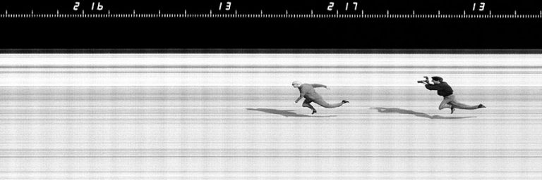 Die Auseinandersetzung der Künstler mit dem menschlichen Leben als Aneinanderreihung von Wettrennen begann vor mehr als drei Jahrzehnten mit der Arbeit am Zyklus THE HUMAN RACE. Die komprimierten „statischen Kurzfilme“ – von KOSCHIES mit einer modifizierten, über sechzig Jahre alten Schlitzkamera in die Zeiträume hinein inszeniert – offenbaren sich in grobkörnigem Schwarz-Weiß auf großformatigen Leinwandbahnen. Sie thematisieren den Wettlauf mit der Zeit als individuelle, gesellschaftliche und vor allem künstlerische Herausforderung.